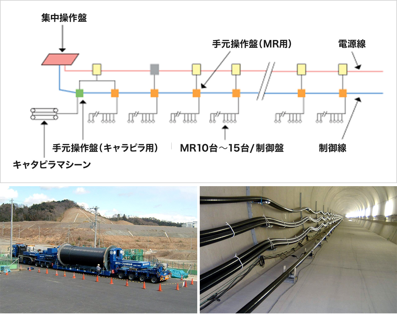 超高圧長尺電力ケーブルを電動ローラー、キャタピラマシーンを使用し、長距離にわたり安全に安定して布設するシステムです。