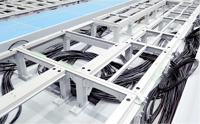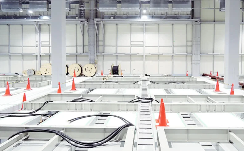 プロジェクトを円滑に進める施工上の工夫は、電気計装工事でも取り入れられた。電池盤などの搬入に先立ち、あらかじめケーブルを敷設しておくことで、スムーズに作業を進行。用いたケーブルは全部で約1,440本、総長は約11万1,000m。それぞれのケーブルの両端に識別シールを貼ったうえで、間違いなく機器に接続されているかを入念にチェックしていった。また、エリアごとに試運転で受電しているケーブルがあったことも、慎重さが求められるポイントだった。そのケーブルが通電しているかどうかは、匂いや目視ではわからない。そのため、受電エリアで盤を開ける等の作業でも試運転班へ確認を取り、感電災害をさせないよう打ち合わせを入念に行うなど、安全性を確保し、慎重に作業を進めていった。