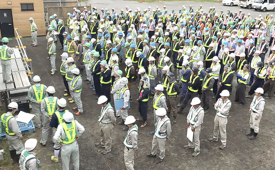 多様な専門部署が連携する際に問題となるのが、無事故・無災害達成に向けた安全管理の意志統一だった。本プロジェクトでは、元請けである鹿島建設の厳格に管理された安全ルールを踏まえて、安全基本ルールと独自の安全ルールを迅速に定着させる必要があった。「そこでタブレット端末を1人1台ずつ導入し、ビジネスチャットツールを活用することにしたんです」。これによって、各現場との連携がスムーズになったのはもちろん、現場の状況写真を共有することで、危険ポイントの注意喚起や作業内容の確認も含めて密にコミュニケーションをとることができたという。「あとは、毎日の朝礼が数少ない作業員との対面の機会となったので、そこでできるだけ声をかけていくように心がけました。工事ピーク時のハードな状況のなかでも、若い社員に『ちゃんと見ているよ』と伝わるように」。