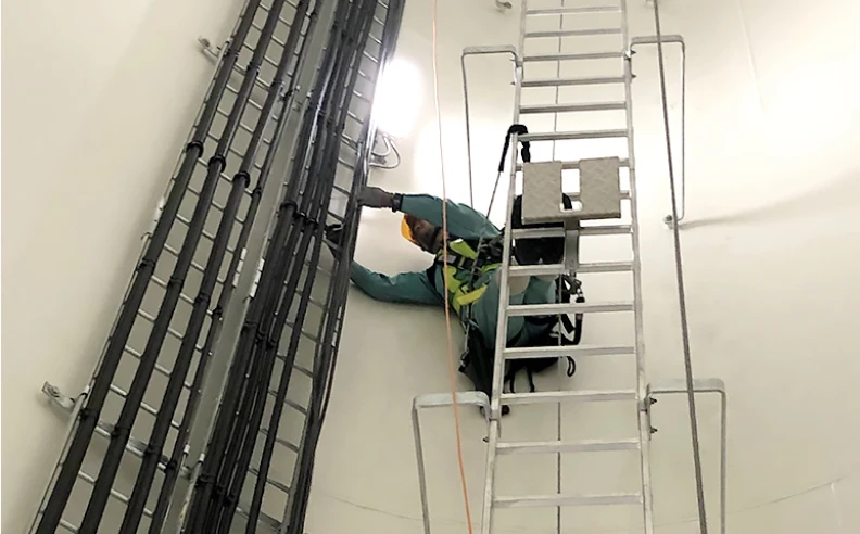 今回、住友電設が担った工事は、風車電気工事、集電管路工事とそこに通す33kVケーブル工事、自営線管路工事、変電基礎・外構工事、光通信工事となる。住友電設内でも経験者の少ない風車電気工事には、普段、工場の電気計装工事を行っているH.H.があたった。風車のタワー部分は、4分割された状態で納入される。作業では、内側にあらかじめ敷設されたケーブルをジョイント部分でつなげるために、風車の中を鉄格子で昇る必要があったという。「100mの高さを毎日昇ることになるので大変でしたね(笑)。多いときには一日2~3回昇降することもあり、おかげで体力がつきました」とH.H.は笑う。
