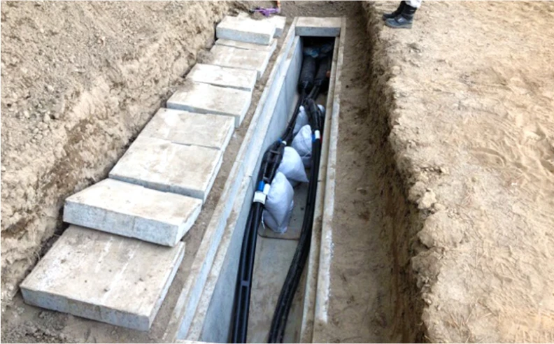 風車から集電された電気は、自営線を通って変電所へと送られる。自営線の管路工事を担当したO.T.は、入社からわずか3年での抜擢となった。田んぼや畑などの間を通す集電管路工事とは異なり、自営線管路工事は主に道路上での土木工事となる。マンホールとマンホールの間を管路でつなげ、そこにグループ会社である住友電気工業が154kVケーブルの敷設を行った。短期間での工事となった本プロジェクトでは、数多くの施工班を投入し、マンホール工事と管路工事を同時に管理する必要があった。